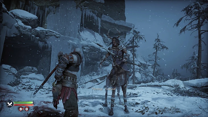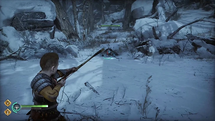 Выйдите из пещеры, и Атрей заметит несколько следов на снегу, которые ведут на юг, мимо упавшего ствола дерева. Продолжайте следовать за Атреем дальше на юг, где вскоре вы встретите большого оленя. После короткой заставки вы будете играть за Атрея. Нацелив лук на сердце оленя, оттяните назад (L2) и выстрелите.