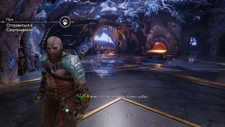 Далее возвращаемся к дому Синдри и смотрим очередную катсцену. За столом Кратос скажет, что следующая цель – Альвхейм, мир эльфов.