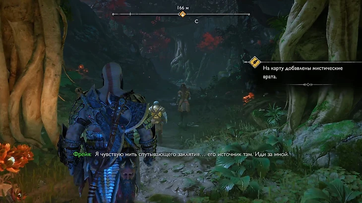 Во время прохождения квеста у вас не будет компаса – он находится у Кратоса. Здесь же все просто – бежим за Ангрбодой. По пути вы найдете сундуки, разобьете несколько камней звуковыми стрелами и сразитесь с монстрами – ничего особо интересного, на чем можно заострить внимание, здесь нет.