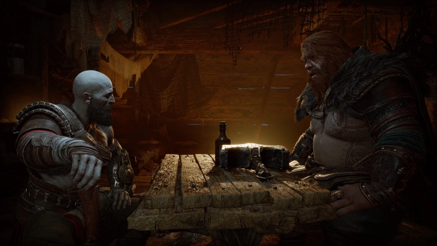 Войдя в таверну, отдайте свое оружие охраннику у двери и следуйте за Труд через переполненный паб Эйнхериев. В конце концов, вы найдете Тора в задней части комнаты. Затем, после продолжительного ролика, вам нужно будет сразиться с пьяным эйнхерием, который нападет на Атрея из-за недоразумения.