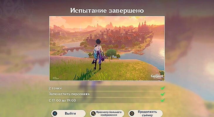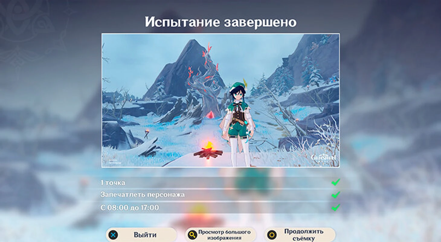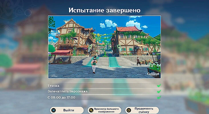 С этапом «Добро пожаловать в Мондштадт» справиться несложно – достаточно подойти к главным воротам города, перемотать время на промежуток с 8 утра до 5 часов дня, настроить камеру и сфотографироваться.