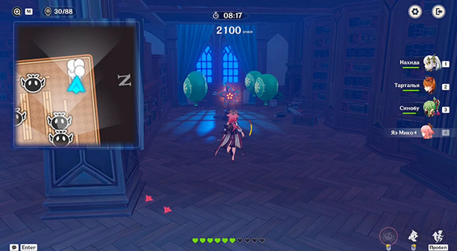 В этом этапе нужно набрать 5500 очков для получения всех наград, поэтому собирайте усиление на драку (ярко-голубое свечение справа на скриншоте выше) и при виде псевдошара атакуйте его. А если усиление закончится в неподходящий момент, можете использовать заграждения. Кстати, псевдошары умеют преследовать и на лестнице.