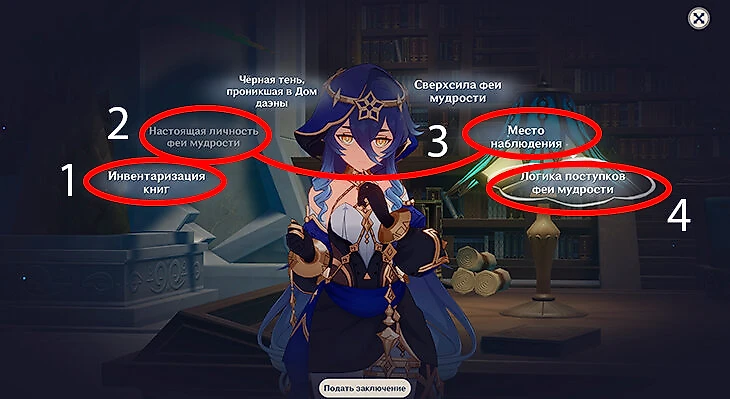 В этом пункте появится мини-игра с трактованием, которой обучали во время прохождения основного сюжета. Выберите вариант «Инвентаризация» и трактуйте его, потом пункт «Настоящая личность феи мудрости» и трактуйте его. Потом нужно сопоставить «Настоящую личность» с «Местом наблюдения», появится пункт «Логика поступков» – его можно подать как заключение. Диалоги в этой главе не влияют ни на что.
