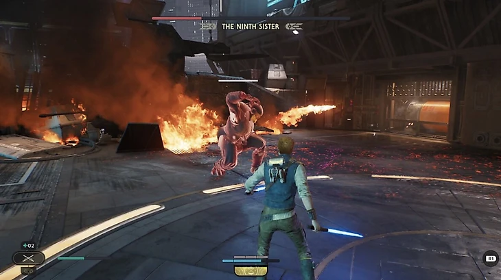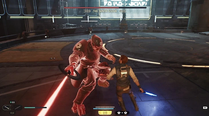 Примерно на половине этого этапа Девятая сестра растопчет и опрокинет вас. Она вернется к использованию Силы, чтобы притянуть к себе и избежать ваших атак. Сосредоточьтесь на парировании, а если у вас есть ультимейт (замедление), активируйте его, чтобы быстро нанести урон. Когда босс будет повержен, начнется финальная сцена.