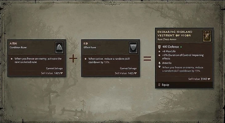 Например, соединив руны Амн и Ко вы получите такой бонус: при заморозке врага снижается время восстановления случайного навыка.
