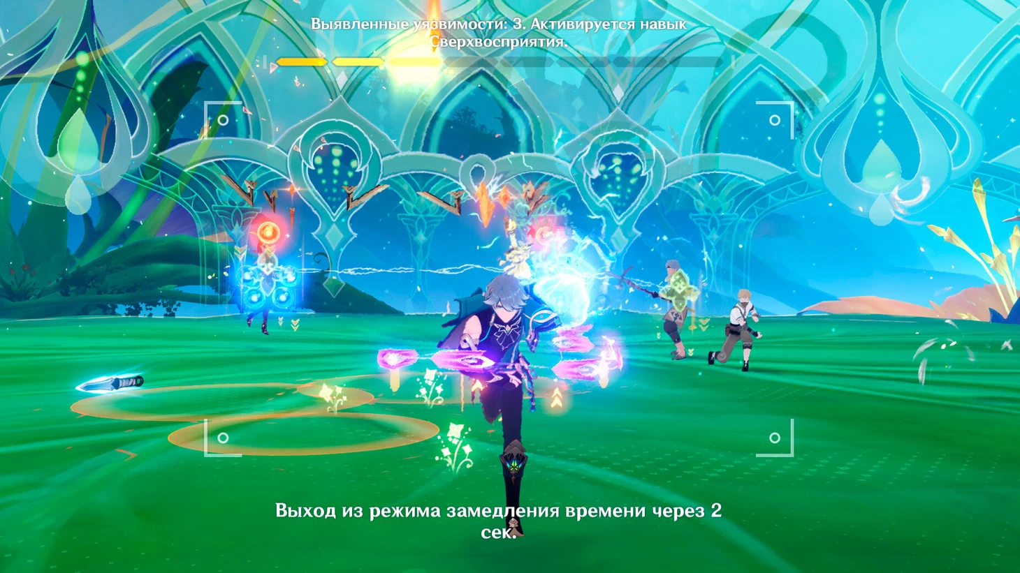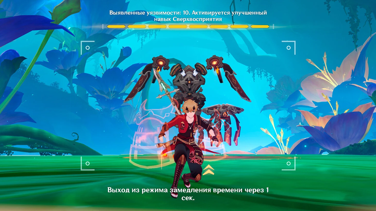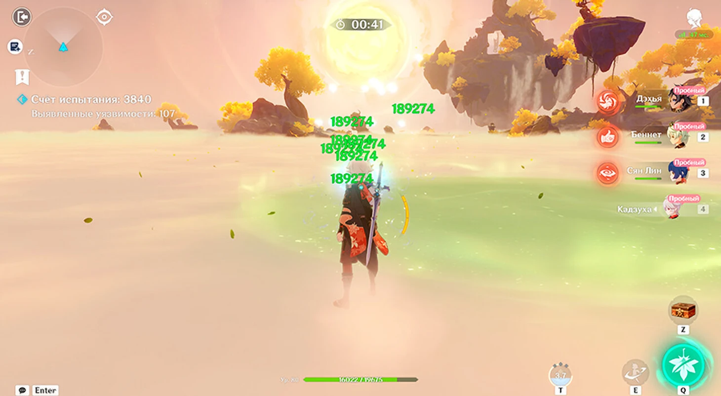 Используйте ульту и Е-шку Беннета, ульту и Е-шку Кадзухи, чтобы понизить сопротивление врагов к Пиро урону. После этого активируйте способности Сян Лин и Дэхьи. чтобы убить врагов. Но сразу всех убивать не надо, только мелких – мини-боссы (зеркальные девы Фатуи, Пустынники, митачурлы) дают большое количество очков уязвимостей. Можете отбежать и нажать на кнопку Сверхвосприятия, чтобы все «попали в кадр» – время замедлится, чем больше уязвимостей попадет в кадр, тем больше будет бонусный урон. За оранжевые уязвимости дают больше очков.