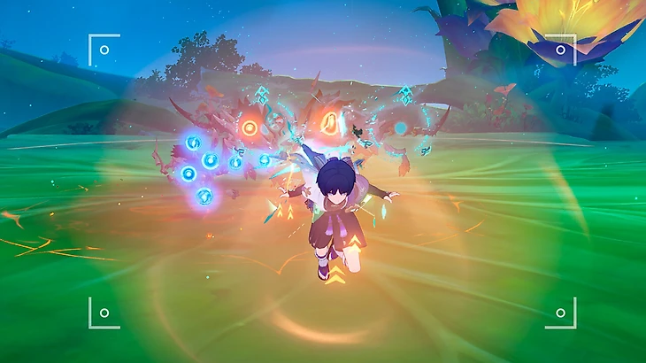 Пробные герои – Сайно, Бай Чжу, Син Цю и Коллеи. Эффект сверхвосприятия наносит Гидро и Дендро урон по площади поочередно, поэтому легко создавать бутоны, которые Сайно будет пулять во врагов. В усиленном эффекте сверхвосприятия урон повышается, а члены отряда восстанавливают больше энергии.