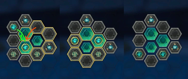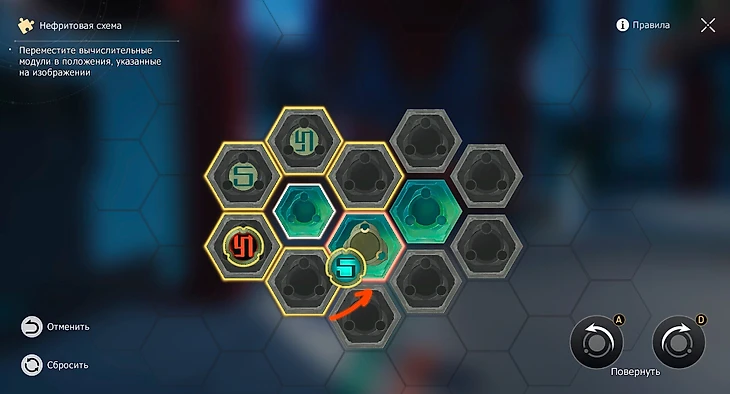 Далее нужно починить робоптаху. Приближайте S к центральному заблокированному кругу так, чтобы она откатывалась обратно. Когда она встанет рядом с Y1, прокрутите их по часовой стрелке вверх, где они должны быть.