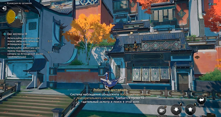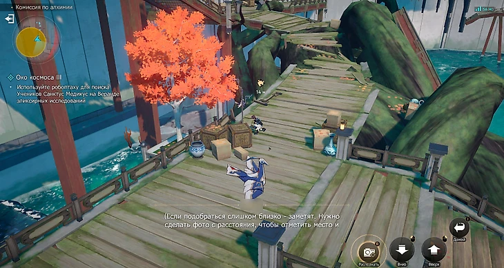 Цзыцяо и Сикуй попросят отследить учеников Санктус Медикус на Веранде эликсирных исследований. Ученик прячется за ящиками на набережной, сделайте фото и прогоните его робоптахой.