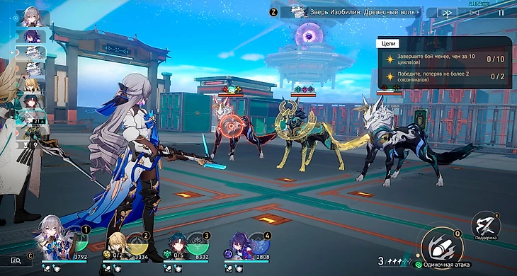 Начните испытание и поговорите с Цзыцяо. Она попросит отогнать волков от робоптахи. У них огненная, ветряная, мнимая, ледяная, электрическая и квантовая уязвимости. Нужно завершить бой менее, чем за 10 циклов, а также не дать союзникам умереть для получения 20 дополнительного нефрита.