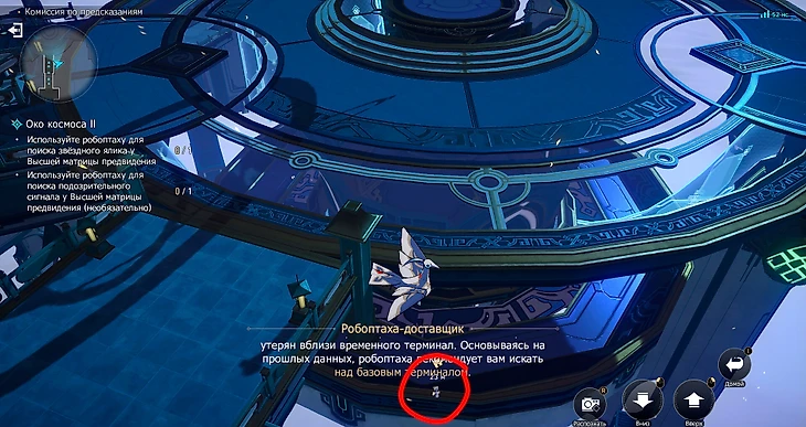 Подозрительный сигнал у Высшей матрицы предвидения издает сломанная робоптаха внизу. Спуститесь к ней и почините, хотя для квеста это не обязательно.