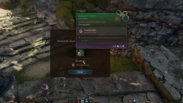После успешного задания вернитесь к Локку и Комире. Они будут благодарны вам, что их дочь выживет, поэтому в знак своей признательности вы получите ценный медальон. Амулет можно надеть на персонажа, благодаря чему герой получит заклинание Пляшущие огоньки.