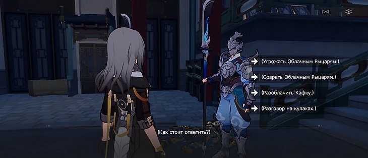 Облачные рыцари помешают доиграть. Любой вариант в диалоге с ними приведет к сражению.