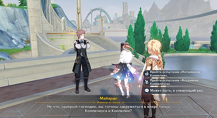 Идите в сторону босса. Рядом стоит Майарде, нужно поговорить с ним, чтобы выбрать, какого босса бить – Коппелию или Коппелиуса. С Коппелиуса падают материалы для героев пневмы (Фремине), с Коппелии – усии (Линетт).