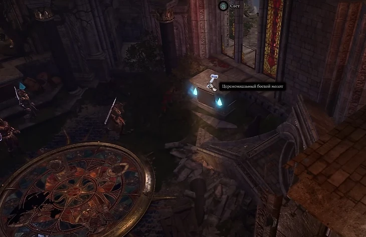 Когда вы найдете все церемониальное оружие, то возвращайтесь к разбитому витражу и поместите его на постамент, каждому оружию соответствует свое место: