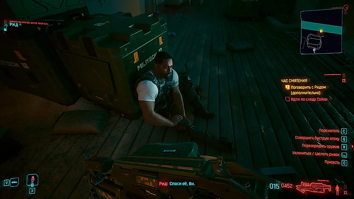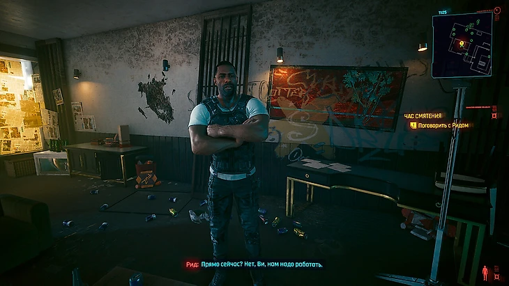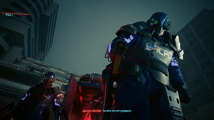 Даллас Фостер – «танк» команды в плотной броне, поэтому разделайтесь с остальными в первую очередь. Можно начать с нетраннера Джаспера Коллинса, чтобы он не посылал вредоносные скрипты в голову Ви. Красная полоска лазера будет время от времени подсвечивать ослабленного Ридом врага, можно в этот момент приблизиться и нанести удар. Самого Рида ранят, после боя поднимитесь по лестнице и поговорите с ним. Он скажет, что ему повезло с несерьезным ранением и отправит Ви по следу Сойки.