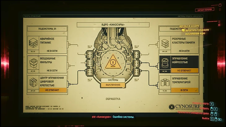 Идите обратно в центр управления. Там запустите процедуру выключения ядра.