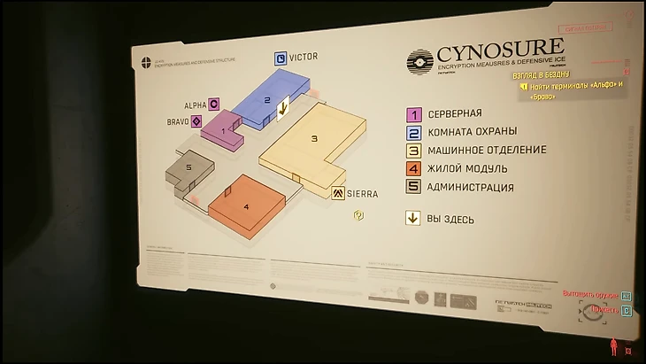 Терминалы «Альфа» и «Браво» находятся в серверной комнате. Вы можете посмотреть карту на стене рядом с вами, чтобы найти путь к серверной, обозначенной фиолетовым цветом.