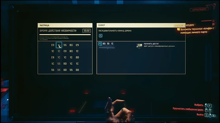 Пройдите вперед и включите терминал «Альфа» с помощью компьютера в центре. Для этого придется пройти простую мини-игру. В открывшемся окне необходимо ввести указанную справа последовательность команд.