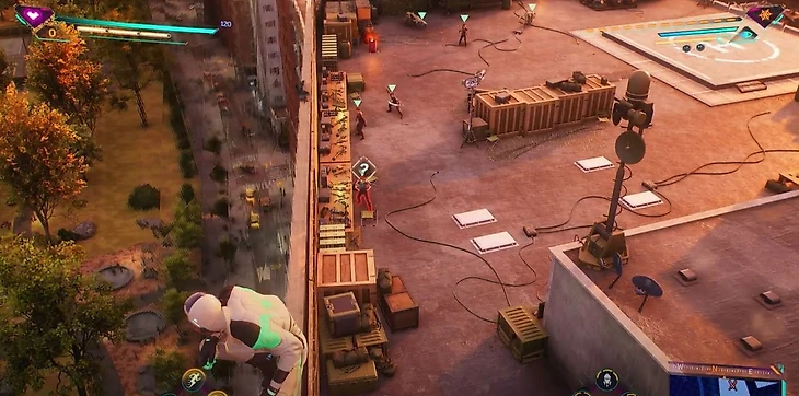 Затем по одному устраняйте врагов внизу, отвлекая их выстрелами из паутины в интерактивные предметы.