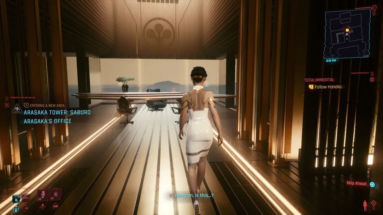 Миссия начнется в Arasaka Tower. Вам нужно будет следовать за Ханако Арасакой, которая попросит вас выступить на совете директоров. Следуйте за девушкой до офиса ее покойного отца Сабуро.