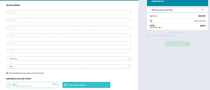 Для приобретения Avatar: Frontiers of Pandora обязательно подключайте VPN для доступа к сайту Ubisoft, так как в России он недоступен. После этого игру нужно поместить в корзину и приступить к процедуре оплаты. Основная трудность заключается в отсутствии удобного для России способа пополнения счета среди предложенных магазином платежных сервисов: