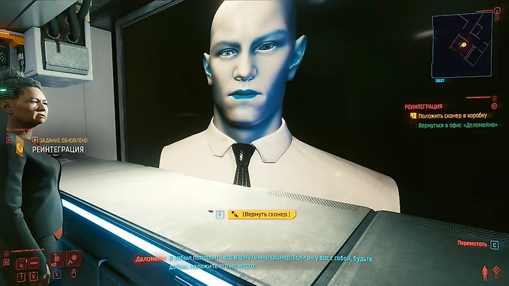 Добравшись на место, зайдите внутрь и вновь заговорите с администратором. Он попросит вас вернуть сканер, после чего поблагодарит за оказанную услугу. Вы также можете задать Деламейну несколько вопросов, которые глубже раскроют его личность.