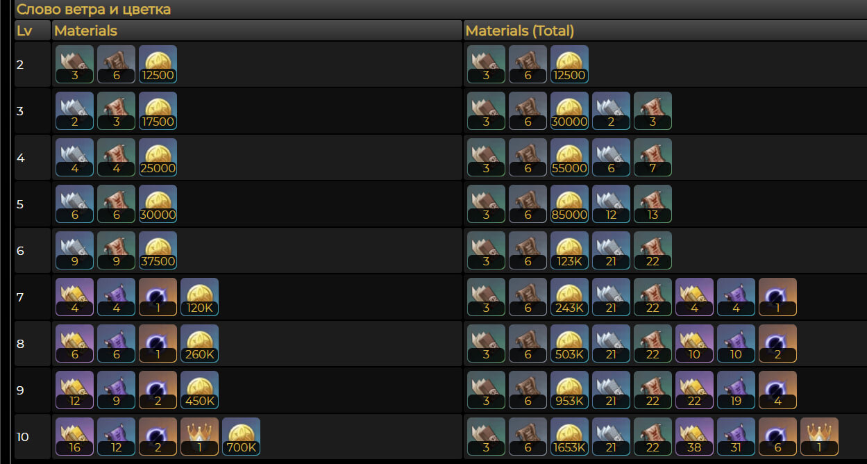 Возвышение одного таланта с 1 по 10 уровень (картинка кликабельна):