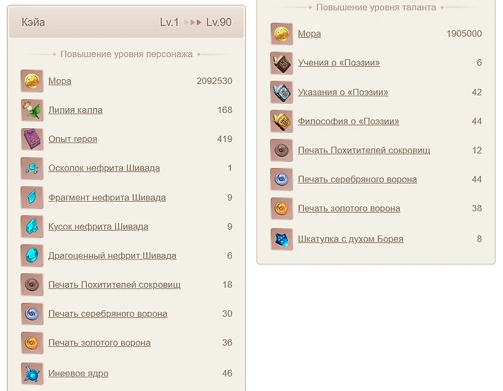 Для прокачки Кэйи до 90 уровня нам понадобятся: