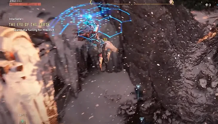 Следующие места для подъема будут еле заметны, поэтому вновь следует использовать визор. Конечной точкой прыжка будет горный выступ, прыгните на него, когда Элой протянет руку, это означает, что он может туда добраться.