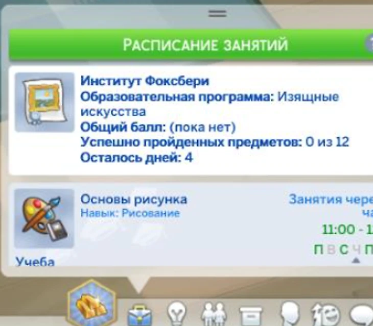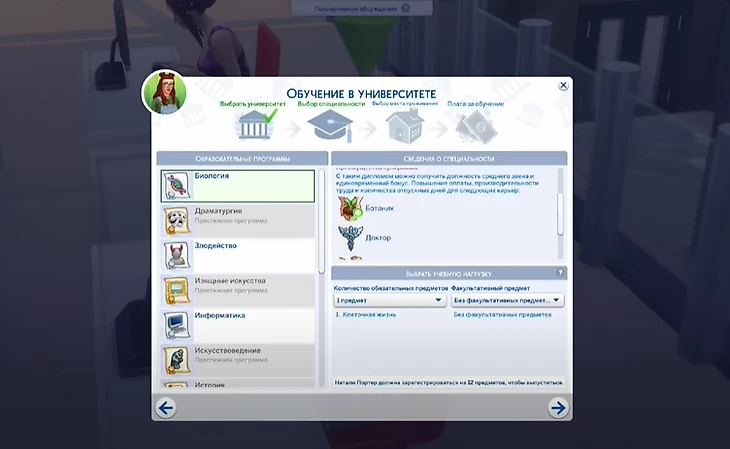 Вы можете выбрать учебную нагрузку, то есть количество предметов для изучения на одном курсе. Для выпуска симу необходимо изучить 12 предметов. Всего за один курс можно выбрать четыре: несколько основных и один факультативный.