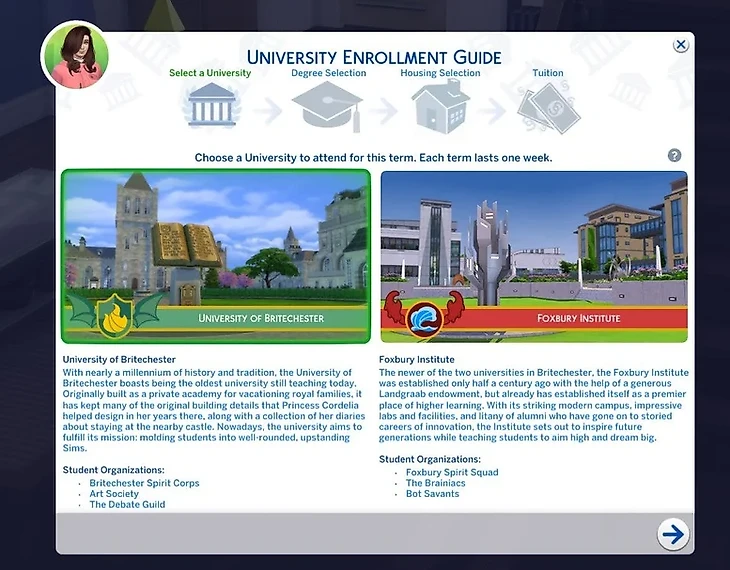 После того, как вы выбрали стипендии, ваш сим может наконец подать заявление на поступление в одно из двух высших учебных заведений. Как это делать, мы написали выше. В Бритчестере два учебных заведения – Университет Бричестер и Институт Фоксбери. Далее вам предстоит выбрать факультет и специальность.