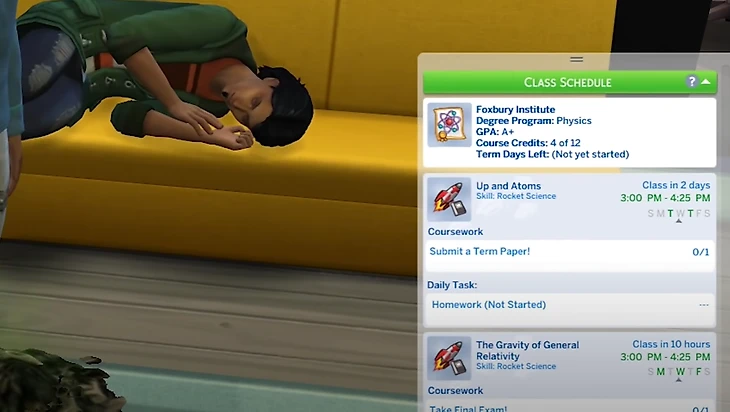 После того как семестр подходит к концу, у вас в меню будет доступно окно с итоговыми оценками и общим баллом успеваемости. Если у вашего сима хорошие оценки, то вам предлагают выбрать предметы на следующий курс, если неудовлетворительные – сим переводится на испытательный срок с возможностью выбора предметов на следующий курс.