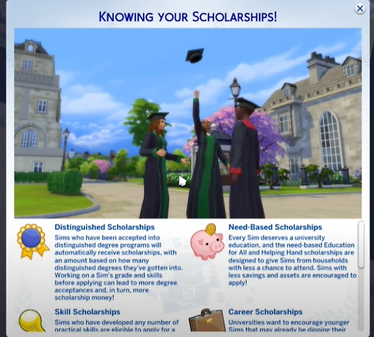 Учтите, что для подачи заявки на стипендию, которая связанна с определенными навыками, эти навыки не обязательно должны быть прокачаны у вашего сима на максимум. Но, конечно, более высокий уровень навыка сима даст преимущество для получения стипендии.