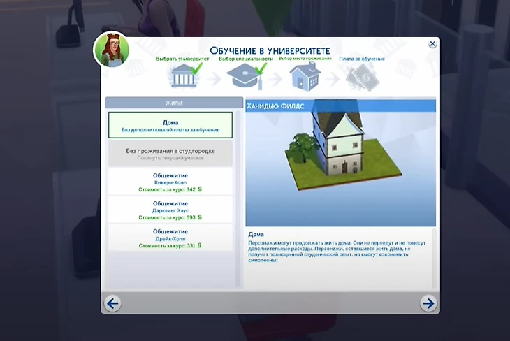 Помните, что если у вашего персонажа есть дети или питомцы, с которыми он не хочет расставаться на время обучения, то в общежитие с ними его не пустят. В этом случае стоит выбрать проживание вне кампуса или вообще никуда не переезжать.
