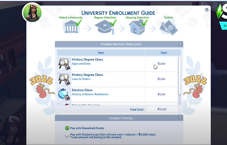 Есть чит, который позволяет вашему симу быстро поступить в университет. Просто нажмите на своего сима, удерживая клавишу Shift, пока не появится надпись «testingcheats on», а затем «Записаться в университет», после чего появится экран зачисления.