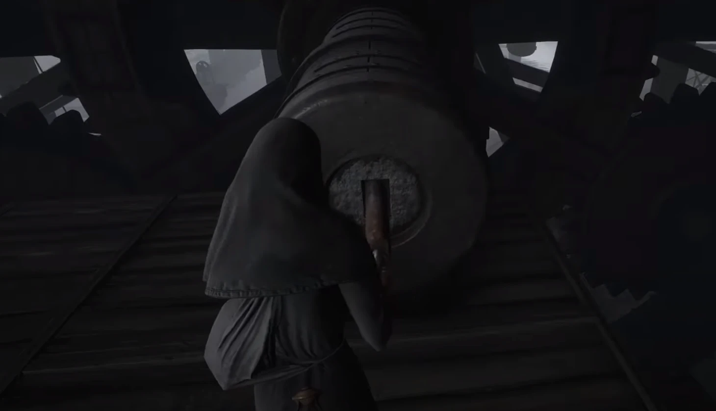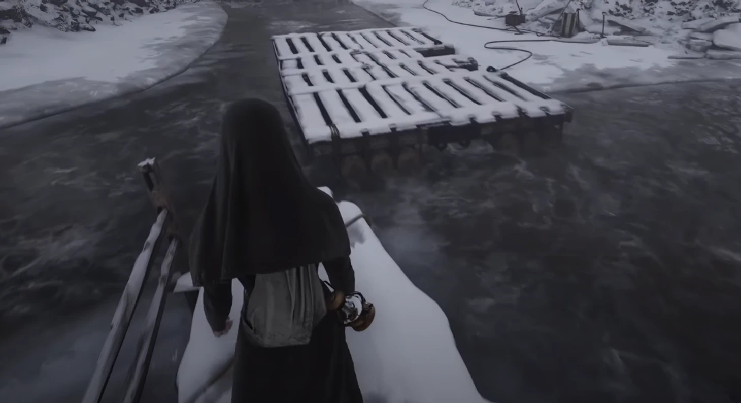Дойдите до переправы, там увидите кат-сцену, после которой будет первая головоломка. Нажмите на рычаг и дождитесь, пока плот остановится на нужном берегу.