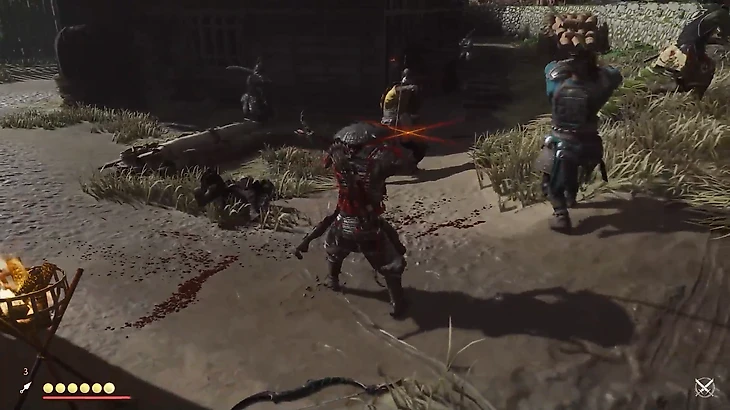Сядьте на коня и дождитесь открытия ворот. Следуйте за господином Симурой, во время поездки будут появляться опции диалога, но они существенно не влияют на игру. Вы увидите несколько горящих зданий, после чего Симура заметит монгольский патруль. Преследуйте и разбейте их. Наиболее эффективно будет использовать стойку Камня, так как в этом бою в основном придется сражаться против мечников. В начале рекомендуем уничтожить единственного лучника, чтобы его атаки не застали вас врасплох.