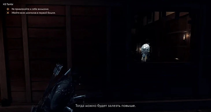 Присядьте под разбитым окном и подождите, пока монгольский охранник остановится в дверном проеме, ближайшем к окну, — убейте его, когда он ненадолго остановится. Пройдите в комнату, в которой он остановился, и спрячьтесь за разбитым окном.