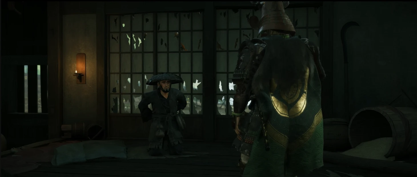 Разобравшись с врагами, заходите в дом. Там вы увидите не Призрака Ики, а уже знакомого вам Кэндзи, который пытался выбраться на большую землю, скрываясь под личиной Призрака, но обидел не тех людей и попал в плен и долги.