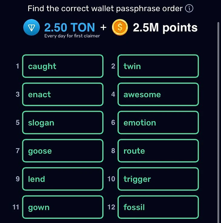 Энигма – это загадка в Rocky Rabbit, которая ежедневно обновляется. Если точнее, то это подбор фраз пароля кошелька из 12 слов в игре. Первый, кто угадает верное расположение слов, получит 2,5 TON и 2,5 млн монет. Но не расстраивайтесь, если не станете первым. Ведь 2,5 млн получат все, кто правильно угадает загадку. Узнать верный код энигмы на сегодня можно на специализирующихся на этом сайтах.