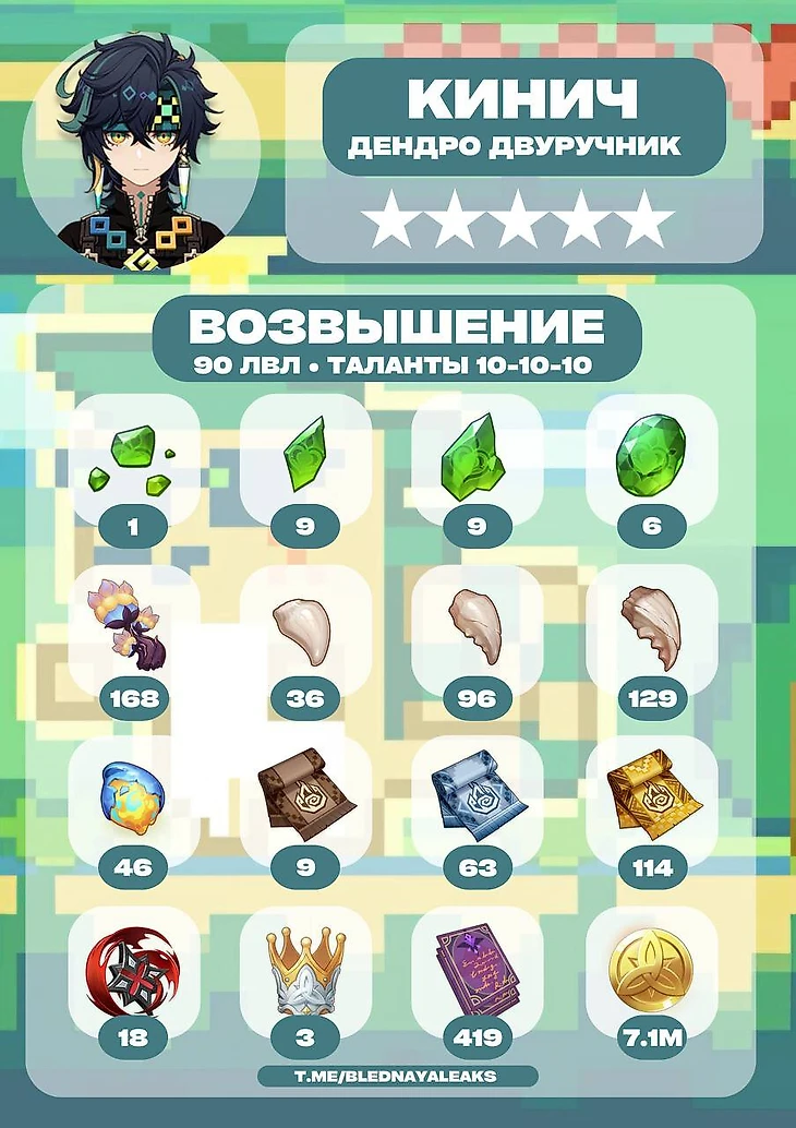 Почти все материалы для прокачки можно будет собрать и нафармить в Натлане. Заранее можно нафармить только книги опыта, мору, короны, Отрицание и вердикт из еженедельного босс-файта с Арлекино, а также изумруды Нагадус различной редкости. Всего понадобится: