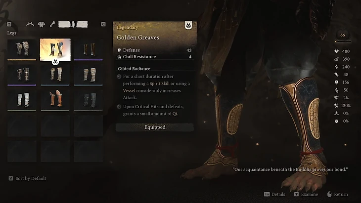 Каждый элемент снаряжения обладает базовым показателем защиты. Кроме того, некоторые части экипировки могут иметь вторичные характеристики, повышающие сопротивление к определенным типам урона или предоставляющие другие бонусы. В Black Myth: Wukong присутствуют комплекты, предоставляющие дополнительные преимущества при ношении нескольких частей из одного набора. Бонусы могут активироваться при экипировке двух, трех или четырех элементов комплекта.