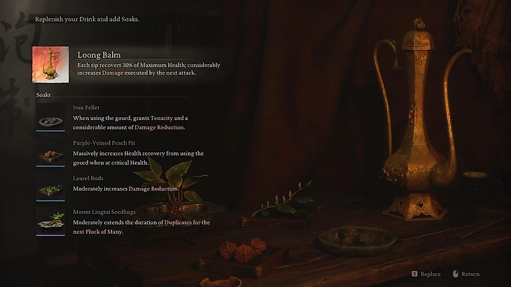 Помимо увеличения количества использований и эффективности исцеления, вы также можете добавлять настои в свой напиток. Эта опция становится доступна после встречи с обезьяной Шэнь и позволяет добавить дополнительные эффекты к вашему напитку. Например, Желчный камень, полученный от обезьяны Шэнь, дает сопротивление к яду. Опция заваривания станет доступна в святилище Хранителя, что избавит вас от необходимости возвращаться к ней каждый раз, когда вы захотите поэкспериментировать с настоями.