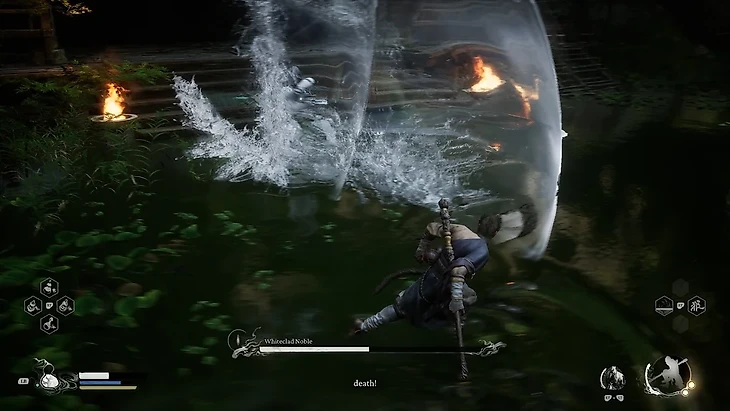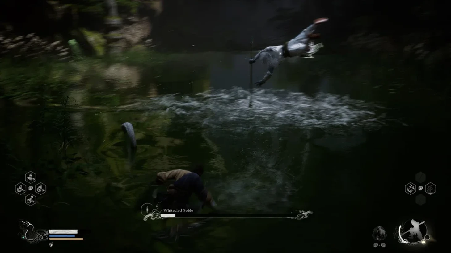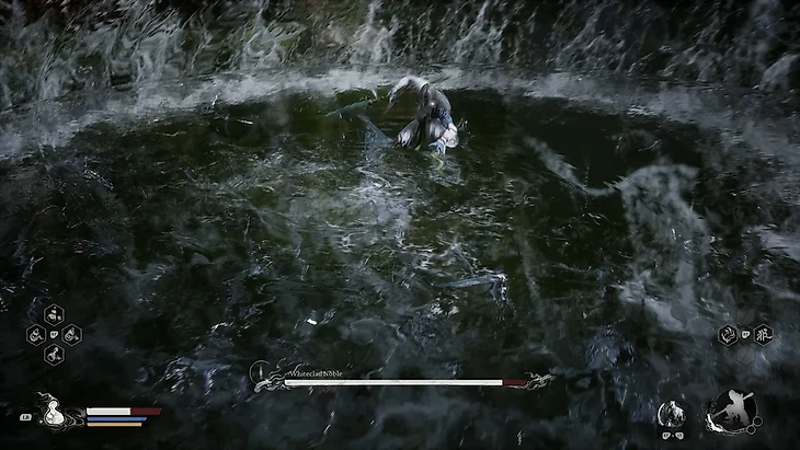 Whiteclad Noble не всегда проводит всю комбинацию целиком. Он может остановиться на полпути, чтобы подготовить следующее движение. Обратите внимание на то, как он отводит копье. После замаха он создаст задержанную водянистую ударную волну. Уклониться от этой атаки непросто, так как ударная волна распространяется на некоторое расстояние. Поэтому вам нужно будет уклоняться к нему, а не от него.