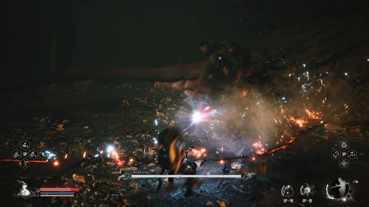 Красный Лун – грозный противник, чьи атаки молниями и обманные маневры могут застать врасплох даже опытного воина. Он умело использует окружение и свои физические преимущества, чтобы контролировать ход битвы. Попытка напасть на него сзади часто приводит к резкому повороту с ударом хвоста, который не только наносит урон, но и отбрасывает вас назад, нарушая ваши планы.