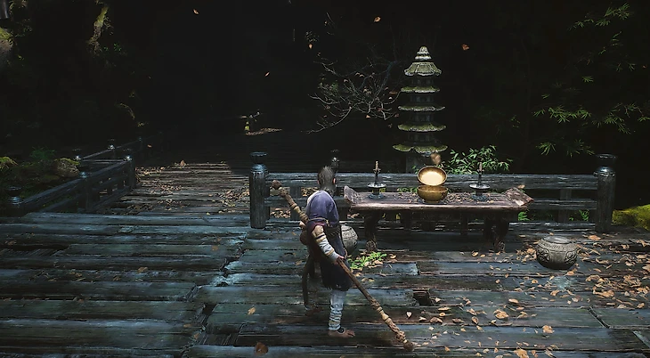 После эпической битвы с Черным Королем Ветра и обретения способности «Шаг по Облаку» продолжайте восхождение. Поднявшись на Пик Бодхи, вы обнаружите пилюлю, ожидающую вас в золотом сундуке слева.