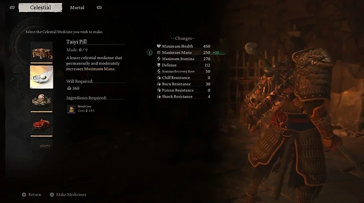 Встретив Xu-Dog после исследования Подвала Храма Крадущегося Тигра, вы обнаружите уникальную возможность получить дополнительные пилюли. Xu-Dog готов изготовить для вас Небесные Лекарства в обмен на Ядра Разума, которые можно найти в сундуках или получить в качестве добычи за победу над особо сильными врагами. Всего вы можете создать девять пилюль Небесного Тайи, что значительно увеличит ваш максимальный запас маны.