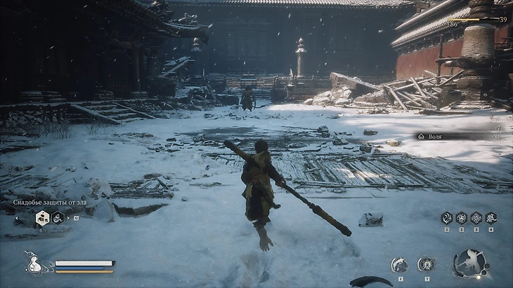 Когда вы наконец достигнете своей цели и вновь примете обличье обезьяны, то окажетесь у подножия величественного святилища Зеркальной Заводи. Загадочный Хранитель Нового Запада поручит вам важную миссию – проникнуть в небольшой храм, затерянный посреди замерзшего озера, и отыскать там очередное Чувство Великого Мудреца.
