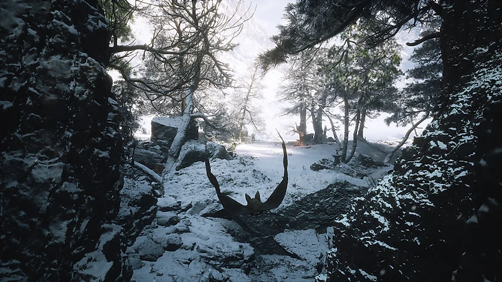 Хотя бескрайняя гладь замерзшего озера может показаться безжизненной пустыней, есть одно местечко, ради которого определенно стоит рискнуть и ступить на лед с правой стороны. Обогните массивные непроходимые скалы и устремитесь дальше, чтобы обнаружить уютную бухточку с одиноким деревцем на противоположном берегу.